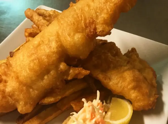 One large piece of crispy beer battered cod fillet served with house-cut chips, tartar sauce and coleslaw.